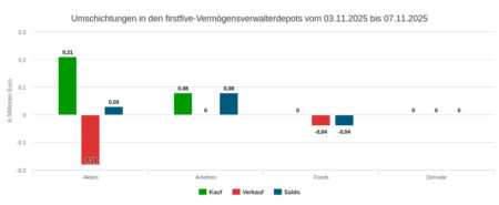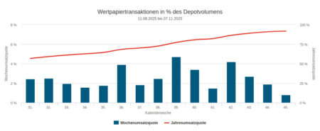 Mit 0,50 Mio. Euro war der Umsatz in der Berichtswoche Nr. 45 bescheiden. Davon entfielen 0,28 Mio. auf Käufe und 0,22 Mio. auf Verkäufe. Der Umsatz des Aktiensegments belief sich auf 0,39 Mio. Euro, gefolgt von Anleihen (0,08 Mio.) und Fonds (0,04 Mio.).
