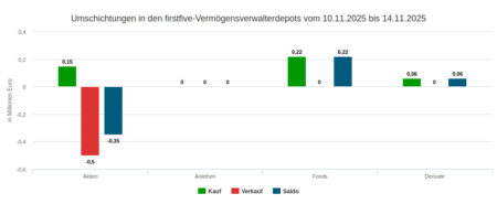 Mit einem Umsatz im Wert von 0,65 Mio. Euro trugen Aktien am stärksten zum Wochenhandel bei, gefolgt von Fonds mit 0,22 Mio. und Derivaten bzw. einem Zertifikat mit 0,06 Mio. Euro. Mit Stücken von Anleihen handelten die für den Newsletter erfassten Vermögensverwaltungen in der Berichtswoche nicht – was selten der Fall ist.
