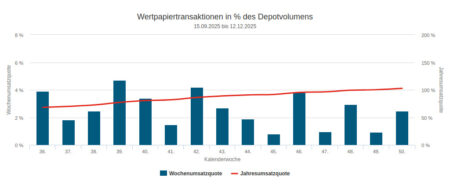 In der 50. Berichtswoche des Jahres entfielen vom Umsatz in Höhe von 4,71 Mio. Euro 2,52 Mio. auf Käufe und 2,19 Mio. auf Verkäufe. Das ist ein moderater Kaufüberhang. Sowohl bei Aktien als auch bei Fonds sahen wir Kaufüberhänge. Bei beiden Untergruppen fielen die Überhänge gleichfalls moderat aus.