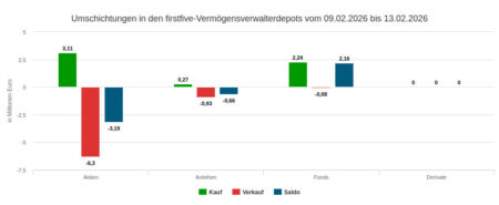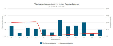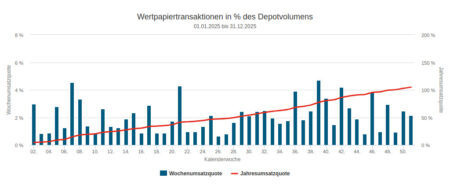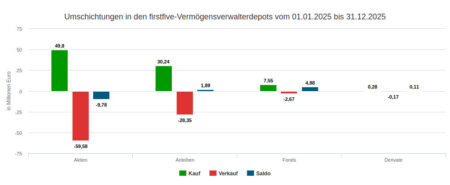 Über das Jahr 2025 betrachtet stellte sich im Handel der für den Newsletter verwendeten Depotausschnitte ein nicht allzu großer Verkaufsüberhang ein: Das Verkaufsvolumen betrug 91,51 Mio. Euro, das Kaufvolumen 87,21 Mio. Euro.