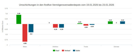 In der 3ten Berichtswoche vom 19. bis 23. Januar setzten die Vermögensverwaltungen unseres Depotausschnitts mit ihren Wertpapiertransaktionen 1,75 Mio. Euro um. Davon waren 0,63 Mio. Euro Käufe und 1,12 Mio. Verkäufe. Damit sahen wir den zweiten Verkaufsüberhang in Folge; denn auch in Woche Nr. 2 war das Verkaufsvolumen größer als das Kaufvolumen.