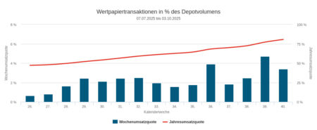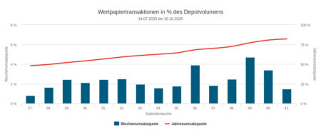 Anders als in Berichtswoche Nr. 40, anders als im Monat Nr. 09 und anders als im Quartal Nr. 03, sahen wir in der Berichtswoche Nr. 41 einen Kaufüberhang. Vom Wochenumsatz in Höhe von 0,87 Mio. Euro entfielen im Zeitraum vom 06. bis 10. Oktober 0,68 Mio. Euro auf Käufe und 0,19 Mi. Euro auf Verkäufe.