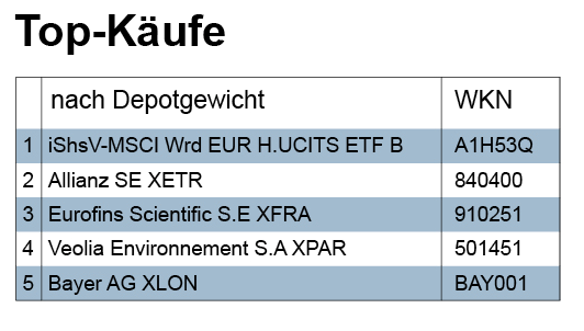 In der Berichtswoche hatte der Kauf eines ETFs auf den MSCI World die größte Depotwirkung. Immerhin über fünf Prozent des Depots bei einer deutschen Großbank bestehen jetzt aus dem währungsgesicherten Papier. Der Euro-Hedge ist übrigens angesichts der Schwäche der Einheitswährung gegen den Dollar für uns eher ein Zeichen für ein strategisches, also langfristiges Anlagemotiv. Zugleich zeigt es, wie weit die Eurokrise schon weggerückt scheint. Noch vor einem Jahr wäre die Überlegung wohl eher gewesen, die Währungsgewinne bei einer weiter anhaltenden und sich möglicherweise verschärfenden Eurokrise aus dem Auslandsinvestment als Bonus mitzunehmen. Heute rechnen professionelle Anleger schon wieder mit der ‚Gefahr‘ steigender Euro-Kurse, die im Umkehrschluss ja Währungsverluste bei fremdwährungsbestimmten Investments bedeuten.
