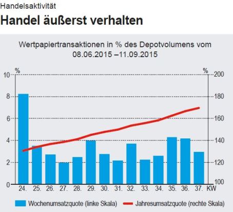 Bloß knapp drei Prozent des gemeldeten Depotgesamtvolumens wurden im Handel umgesetzt. Aber selbst bei Betrachtung dieses unterdurchschnittlichen Werts dürfte der regelmäßige Leser des Newsletters spontan das Handelsvolumen überschät-zen. Denn einige Verwaltungen mit größeren Depots haben bis zur Erstellung des Letters ihre Daten noch nicht übermittelt. Das Ergebnis: ein sehr geringer Betrag mit untypischen 8,66 Mio. Euro – eine Summe, die mitunter in nur ein Papier gesteckt wird.