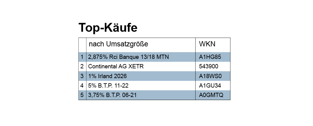 Die am 22.03.2013 emittierte RCI-Banque-Anleihe mit fünfjähriger Laufzeit rentiert aktuell mit 1,657%. Eine Vermögensverwaltung hat in der Berichtswoche allein über drei Millionen Euro in dieses Bankpapier investiert und darüber hinaus auch in eine Reihe weiterer Bankanleihen mit unterschiedlichen Ratings und Laufzeiten zwischen 2 und 5 Jahren. Darunter waren u.a.: Bank of China (A1Z3RD), Goldman Sachs (A1Z6FP), Rabobank (A1Z7R1).