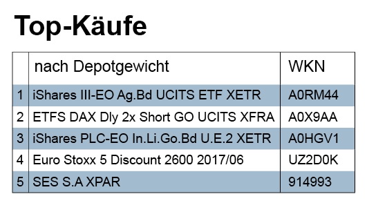 Auf Platz zwei der relativ stärksten Käufe mit einem initialen Depotgewicht von immerhin drei Prozent steht der Kauf eines Double-Dax-Shorters. Das Prinzip: Mit jedem Punkt, den der DAX verliert, gewinnt das Zertifikat zwei hinzu. Das Papier wurde am 13.6. zu 9,08 Euro gekauft. Gestern (am 21.6.) notierte es noch bei 8,45 Euro. Von den rund 125.000 Euro die der Verwalter einsetzte, sind nach wenigen Tagen fast zehn Prozent verloren. Ob sich der Entscheider ärgert, ist selbstverständlich nicht gesagt. Schließlich kann das Papier mit Blick auf den Brexit als Sicherung eingekauft worden sein und das Depot mag insgesamt von der guten Aktienmarktentwicklung der vergangenen Tage profitiert haben.