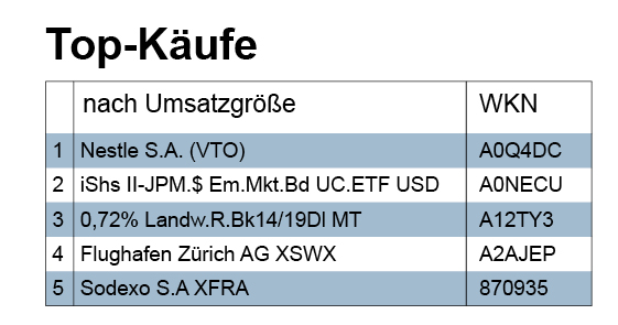 Die Kaufvolumina der Berichtswoche teilten sich auf in: Aktien (2,65 Mio. Euro Kaufumsatz), Fonds (0,38), Anleihen (0,38), Zertifikate (0,28). Aktien wurden also am stärksten präferiert, auch wenn sich die europäischen Aktienmärkte und die wichtigsten US-Indizes in der Berichtswoche leicht abwärts bzw. seitwärts bewegten.
