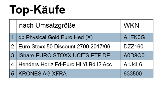 Bei den Käufen in der Berichtswoche im Wert von 5,78 Mio. Euro lagen umsatzmäßig Zertifikate mit 2,92 Mio. Euro in Führung vor Aktien (1,24), Fonds (0,89) und Festverzinslichen (0,42). Was mit Blick auf unsere Handels-Daten ganz selten eintritt, ist das unser Topkaufranking der Berichtswoche dem der Vorwoche ähnelt. Was also für die firstfive-Favoriten bei Aktien und Wertpapieren die Regel ist, ist für die Topkäufe und auch -verkäufe die Ausnahme. Für die Berichtswoche sind wir Zeuge einer solchen Ausnahme: der Erstplatzierte bei unseren Topkäufen gemäß Umsatzvolumen ist identisch mit dem Sieger die Woche zuvor: es handelt sich um den bereits erwähnte Gold-ETC der Deutschen Bank (A1EK0G).