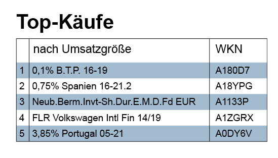 Am Donnerstag der Berichtswoche investierte eine Vermögensverwaltung in eine Portugal-Anleihe (WKN: A0DY6V), die bis April 2021 läuft. Am Freitagabend der Berichtswoche wurden dann die Ratingentscheidungen von Euroländern verschiedener Agenturen bekanntgegeben. DBRS beließ es bei der bisherigen Einschätzung Portugals im untersten Investment-Grade-Bereich (BBB). Dementsprechend legten die Kurse portugiesischer Staatsanleihen, auch der Kurs der oben erwähnten Anleihe, zu Beginn der neuen Woche deutlich zu. Inwiefern die Käufe im Segment der Staatsanleihen in der Berichtswoche in Anbetracht der erwarteten Ratingentscheidungen auch spekulativ motiviert waren, entzieht sich bislang unserer Kenntnis. Betrachtet man vor dem aktuellen Rating-Hintergrund die im absoluten Ranking erstplatzierte Italien-Anleihe (A180D7), dann ist festzuhalten, dass Fitch den Ausblick für Italien, wie am Freitagabend der Berichtswoche ebenfalls bekannt gegeben wurde, von „Stabil“ auf „Negativ“ senkte. Als hauptsächlicher Grund werden die vielen Verzögerungen bei der geforderten Konsolidierung der Staatsfinanzen angeführt, was die Glaubwürdigkeit des Landes unterminiere. Ein Kursimpuls blieb wohl auch deshalb zu Beginn der neuen Woche aus.