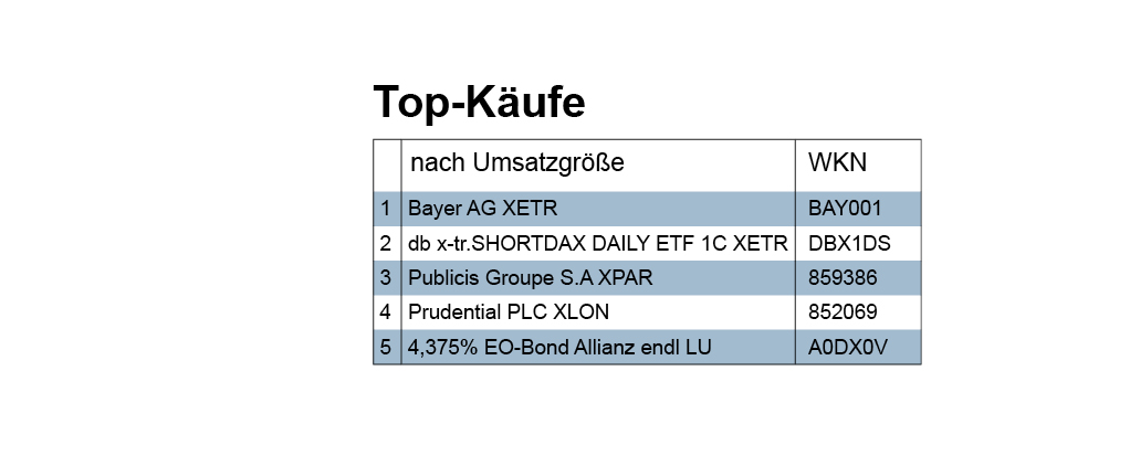 Aktien trugen zum Kauf-Umsatz der Berichtswoche 0,75 Mio., Derivate 0,09 Mio., Fonds 0,22 Mio. und Anleihen 0,14 Mio. Euro bei. Demgemäß sind in unseren Listen der zehn meistgekauften Wertpapiere Aktien häuftiger vertreten als sonst.