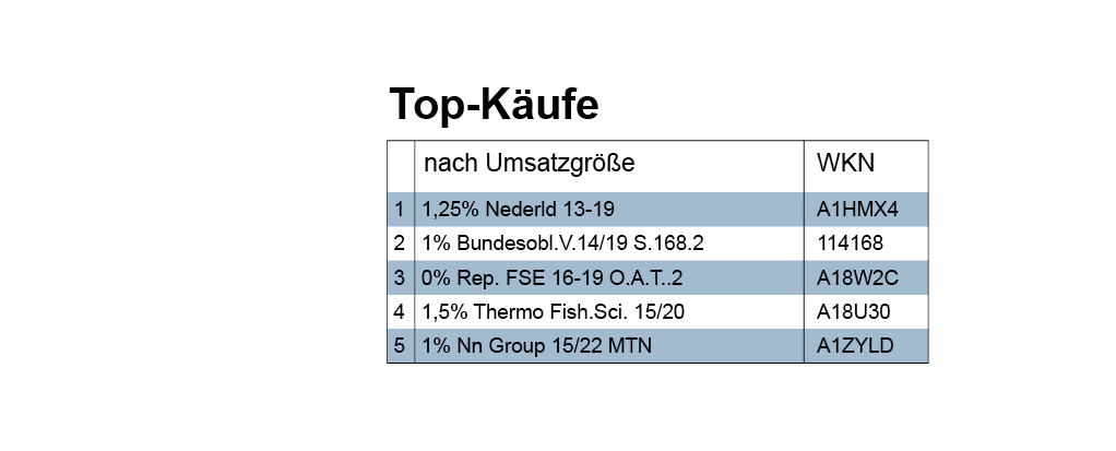 Auch bei etwas positiverer Erwartungshaltung ist es aber derzeit wenig verwunderlich, dass Investoren zurückhaltender operieren. Das sehen wir, wie schon in den Wochen zuvor, auch bei den von uns erfassten Käufen: Relativ geringes Volumen; keine Fonds; wenige Aktien; deutlich mehr Anleihen, die folglich auch die beiden Top-Kauf-Rankings dominieren. Während die gelisteten Staatsanleihen mit 0 Prozent (A1HMX4; 114168) oder weniger (A18W2C) rentieren, kommen die Unternehmensanleihen auf Werte um die