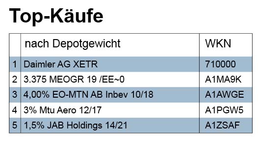 In der Berichtswoche waren insbesondere Daimler und Zurich Insurance gefragt. Daimler führt die Rangliste der größten relativen Käufe an. Im Depot des Kunden machte Daimler nach dem Kauf immerhin fast fünf Prozent des Gesamtvermögens aus. Es handelt sich um ein kleineres Depot in der Obhut eines Hamburger Hauses. Das ist typisch, denn die Rangliste der relativ stärksten Käufe widerspiegelt eher die Präferenz kleinerer Depots, die weniger stark diversifizieren (können).