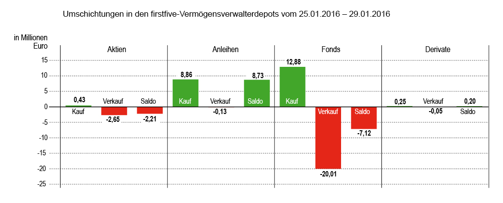 Im Segment der Festverzinslichen stachen insbesondere zwei Staatsanleihen – eine französische und eine deutsche – aufgrund sehr hoher Investitionssummen einer Verwaltung mit großem Depot heraus (siehe „Käufe“). Ansonsten wurde nur in Unternehmensbonds investiert. Auch Fondsanteile wurden wieder – nach zwei Wochen äußerster Zurückhaltung – in Depots genommen, wobei insgesamt sogar vier Millionen Euro mehr ausgegeben wurden als für Anleihen. Bis auf eine Transaktion handelte es sich hierbei ausschließlich um ETFs, überwiegend Aktien (Europa, USA), aber auch Renten. Verkaufsseitig fielen drei ETF-Transaktionen wegen großer Volumina auf. Aktien wurden überwiegend verkauft, wobei die hohe Zahl von Transaktionen quer durch das Aktienuniversum der letzten Monate bemerkenswert war.