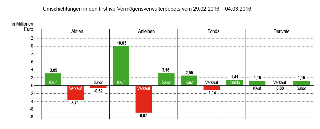 Zwar überstieg das Volumen der Ankäufe jenes der Verkäufe um 44 Prozent. Die Anzahl der Käufe lag aber nur bei drei Viertel jener der Verkäufe. Das ist in der Hauptsache darauf zurückzuführen, dass vor allem im Rentensegment pro Kauf mehr in die Hand genommen wurde als pro Verkauf den Depots wieder zufloss. Dieses Handelsmuster wurde nicht unwesentlich von einer Vermögensverwaltung mit größerem Portfolio bestimmt, die offenkundig von Unternehmensanleihen auf Staatsanleihen umschichtete und zudem noch etwas kostbare Sicherheit draufsattelte. Den Aktienverkäufen drückte eine andere größere Vermögensverwaltung ihren Stempel auf. Sie veräußerte ein kleines, aber wohldiversifiziertes Aktienuniversum der Regionen USA und Europa. Anders beim Einkauf: Hier versuchten deutlich mehr Verwaltungen an der Aufwärtsbewegung zu partizipieren. Insofern scheint bei Aktien der Kauf repräsentativer zu sein als der Verkauf. Würde man demgemäß den Handel der hier dominierenden Verwaltung als Ausreißer nicht werten, dann hätten die Aktienkäufe klar das Übergewicht gehabt.