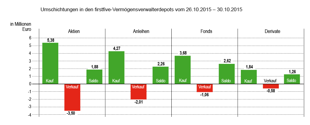 Die Händler investierten in beinahe alle Produktklassen, die wir unterscheiden – nur in Futures nicht: Gesucht waren jedoch vor allem Aktien, Anleihen, Fonds und Zertifikate, jeweils bei deutlichem Kaufüberhang. Unter den Aktienkäufen befanden sich viele Favoritenpapieren der letzten Monate, u.a.: Priceline, Sampo, Imperial Tobacco, Bayer, Nestlé, Rotork. Europa war bei Aktien „Kern“, die USA Peripherie (gefragt z.B. Pay Pal, Halliburton), Asien nonexistent. Bei Festverzinslichen fanden fast nur Unternehmensanleihen die Gunst der Entscheider; aus Peru kam die einzige Staatsanleihe. Fonds trugen, anders als in der Vorwoche, wieder zum Handel bei. Auffällig ETFs auf den EuroStoxx 50. Der war auch Basiswert der Zertifikate, die gefragt waren.
