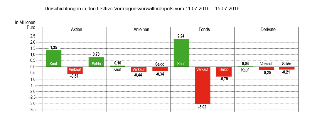 In Zeiten, in denen Gold gefragt ist, ist meist auch Silber ganz oben auf dem Siegertreppchen. Warum erscheint dann in der Berichtswoche unter den Top-Verkäufen ein ETFS Physical Silver? Dem werden wir unter „Verkäufe“ kurz nachgehen. Das auf einer Top-Verkaufsliste auch ein ETF mit Short-Strategie steht, der unseren treuen Lesern zwischenzeitlich vertraut sein dürfte – und der mit einem anderen Fonds den gesamten Verkaufsumsatz bei Fonds trug –, kommt in Anbetracht steigender Kurse nicht unerwartet. Auch Aktien wurden abgegeben, wenngleich der Kaufumsatz in diesem Segment höher war. Insgesamt überragten jedoch die Verkäufe mit 4,29 Mio. Euro die Käufe mit 3,74 Mio. Beim Kaufumsatz lagen Fonds – 2 Aktien- 2 Bond- und ein Volatilitäts-ETF – mit 2,24 Mio. Euro vor Aktien (1,35) und Anleihen (0,1).