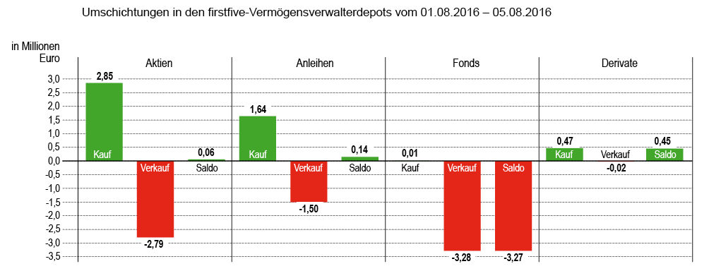 Die Verkäufe hatten in der Berichtswoche insgesamt ein klares Übergewicht gegenüber den Käufen. Der Hauptgrund dafür ist der starke Verkaufsüberhang bei Fonds. Es stand nur ein Fonds-Investment auf den uns übermittelten Einkaufszetteln. Das ist aber nicht der Grund für diese Asymmetrie. Denn auch auf der Verkaufsliste stand nur ein Fonds. Der Überhang resultiert daraus, dass das Engagement bei einem Platin-ETF sich lediglich im oberen vierstelligen Bereich befand, wohingegen der Verkaufserlös bei einem Geldmarktfonds über 3,28 Mio. Euro betrug.