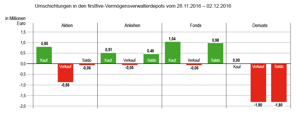In der Berichtswoche erzielten Zertifikate mit knapp 1,8 Mio. Euro den höchsten Umsatz, gefolgt von Aktien (1,66), Fonds (1,1) und Anleihen (0,56). Der Verkaufsumsatz lag ein wenig über dem Kaufvolumen: während bei Aktien der Verkaufsüberhang relativ gering war, bei den Zertifikaten / Derivaten aber absolut (d.h.: keine Käufe), wurde im Fonds- und Rentensektor weit überwiegend gekauft.Allerdings verteilten sich bei Fonds und Obligationen die gehandelten Summen auf nur wenige Transaktionen bzw. Wertpapiere.