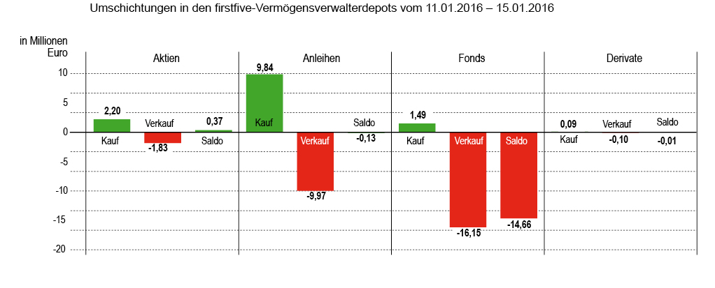Der Handel wurde dominiert von Fonds und Anleihen. Für den hohen Verkaufsüberhang waren hauptsächlich Fonds verantwortlich. Heraus stachen im Hinblick auf das Transaktionsvolumen ETFs auf Aktien- oder Anleihenindizes verschiedener Regionen oder Branchen, etwa ein Japan-Aktien-ETF, ein Staatsanleihen-ETF oder ein Bank-Anleihen-ETF. Aktiv gemanagte Fonds – teils Aktien, teils Anleihen, teils Multi-Asset – wurden gleichfalls weggegeben, allerdings war dieser Verkaufsumsatz geringer. Sowohl bei Anleihen wie auch bei Aktien waren Kauf- und Verkaufsvolumina annähernd ausgeglichen. Allerdings machte der wieder einmal stark auf Europa fokussierte Aktienhandel nur knapp ein Fünftel des Umsatzes im größtenteils auf Unternehmensbonds beschränkten Anleihenuniversum aus.