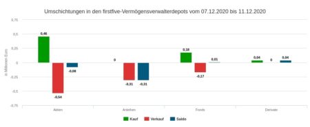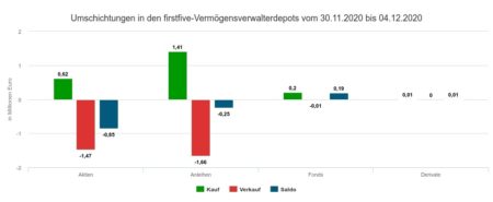 In der Handelswoche Nr. 50 vom 07. bis 11. Dezember 2020 wurden mit den getätigten Transaktionen 1,69 Mio. Euro umgesetzt. Davon waren 0,68 Mio. Euro Käufe und 1,01 Mio. Euro Verkäufe. Wie schon in der Vorwoche ergab sich also wieder ein Verkaufsüberhang. In der Berichtswoche war dies das Ergebnis der Handelsstruktur im Aktien- und Rentensegment – denn bei Fonds und Derivaten überwogen die Käufe (siehe Schaubild).