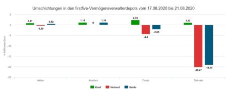 Die Käufe in der 34. Berichtswoche im Wert von 5,53 Mio. Euro verteilten sich auf Fonds (2,34 Mio. Euro), Anleihen (1,16 Mio.), Derivate (1,13 Mio.) und Aktien (0,91 Mio.).