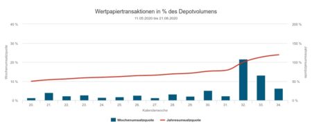 Die Berichtswoche 33 vom 10. bis 14. August war der Woche 32 strukturell in vielem ähnlich: Ungefähr der gleiche Depotausschnitt, dessen Daten dem Newsletter zugrunde lagen; sehr hoher relativer und absoluter Umsatz (siehe Umsätze und Quoten); sehr hoher Aktien- und Fondsumsatz sowie geringerer Rentenumsatz.