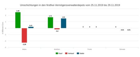Die Verkäufe der 48ten Woche in Höhe von 2,49 Mio. Euro verteilten sich auf Aktien (2,28 Mio. Euro), Anleihen (0,20 Mio. Euro) und Derivate (0,01 Mio. Euro).