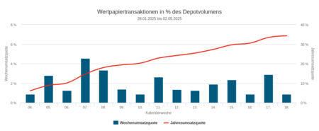 Mit 1,97 Mio. Euro war der Umsatz in der Berichtswoche vom 12. bis 16. Mai etwas geringer als in der Vorwoche, in der 2,35 Mio. gehandelt worden waren. Deutlich geringer waren im Wochenvergleich die für den Newsletter erfassten Assets under Management mit 113,06 Mio. Euro (vs. 267,79 Mio. in W. 19). Deshalb lag in Woche 20 die Umsatzquote mit 1,74 Prozent auch deutlich höher als in Woche 19 mit 0,88 Prozent. Addiert um diesen Wert hinzu, kommt die seit Jahresbeginn kumulierte Quote unserer Ausschnitte 36,90 auf Prozent. Vor einem Jahr, also Ende Woche 20 / 2024, waren es 44,09 Prozent. Gewiss kein uneinholbarer Wert.