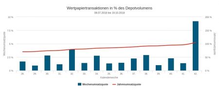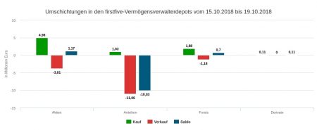 Die Käufe in der 44. Woche in Höhe von 13,12 Mio. verteilten sich wie folgt auf die einzelnen Produktklassen: Anleihen 6,16 Mio. Euro; Aktien 6,13; Fonds 0,79; Derivate 0,04. Damit machten in der Berichtswoche Käufe bei Aktien und Anleihen zusammen rund 94% des Kaufumsatzes aus.