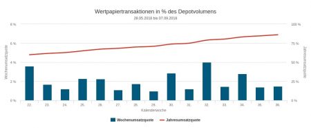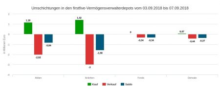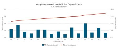 Die 36. Berichtswoche vom 3. bis 7. September war von Verkäufen geprägt. Vom Umsatzvolumen in Höhe von 8,46 Mio. Euro entfielen 2,67 Mio. auf Käufe und 5,79 Mio. auf Verkäufe. Differenziert man die Umsätze nach Assetklassen, dann ergibt sich folgende Reihenfolge: Anleihen 4,42 Mio. Euro; Aktien 3,20 Mio.; Derivate 0,51; Fonds 0,34. Damit weist die Berichtswoche wieder ein Handelsmuster auf, das auch im Juni und Juli häufiger zu beobachten war: