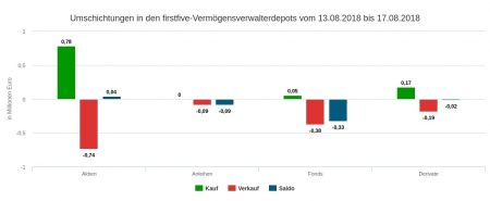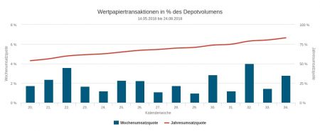 Die Umsatzquote in der 34. Berichtswoche vom 20. bis 24. August betrug 2,79%. Das ist langfristig betrachtet ein durchschnittlicher Wert. Weil das uns für den Newsletter gemeldete Depotvolumen in Höhe von 478 Mio. Euro ebenso im Durchschnittsbereich lag, fiel dann auch der Wochenumsatz mit 13,34 Mio. Euro durchschnittlich aus.