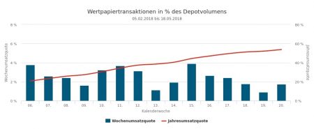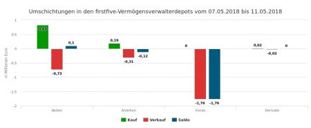 Die Verkäufe in der 22. Woche in Höhe von 3,05 Mio. Euro verteilten sich auf Aktien (1,83 Mio. Euro), Fonds (0,79) und Anleihen (0,43), Derivate wurden keine verkauft. Aktienverkäufe machten damit exakt 60% des Verkaufsumsatzes aus, Fonds kamen auf 26% und Anleihen auf 14%. In der Datenliste der Aktienverkäufe der Berichtswoche stehen neben den in den beiden Rankings gelisteten u.a. Microsoft, Allianz, Assicurazioni Generali, Nestlé, Align Technology oder Stora Enso Oyj.