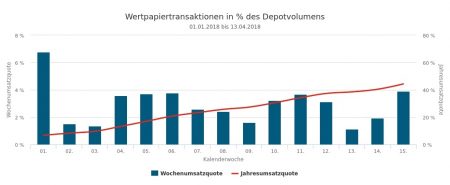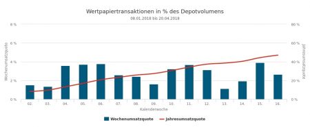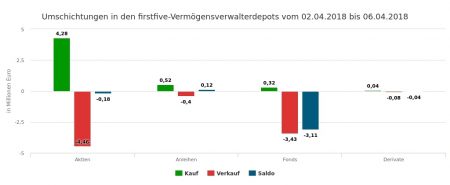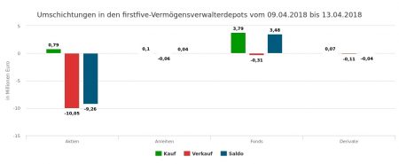 Die Verkäufe der 17. Berichtswoche im Wert von 8,72 Mio. Euro verteilten sich auf Fonds (7,41 Mio. Euro), Anleihen (0,64), Aktien (0,62) und Derivate (0,04). Damit entfielen 85% des Verkaufsumsatzes auf Fondsanteile. Ähnlich also wie bei den Käufen die Anleihen, so dominierten bei den Verkäufen Fonds das Handels-Geschehen.