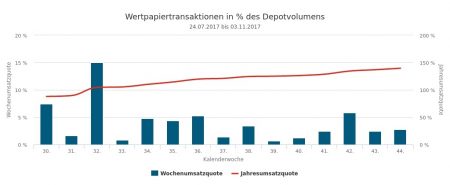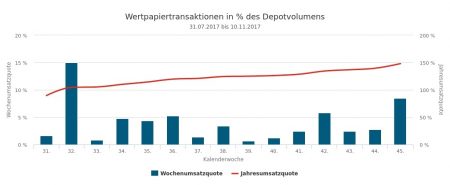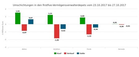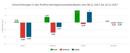 Die Verkäufe der 46. Berichtswoche im Gesamtwert von 5,61 Mio. Euro verteilten sich auf Aktien (3,19 Mi. Euro), Anleihen (2,29), Fonds (0,12) und Derivate (0,02).