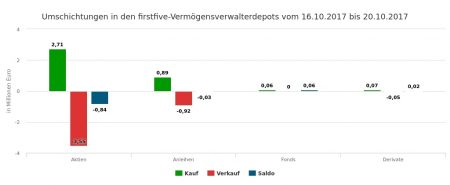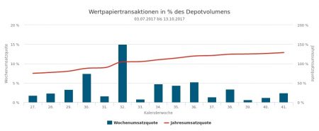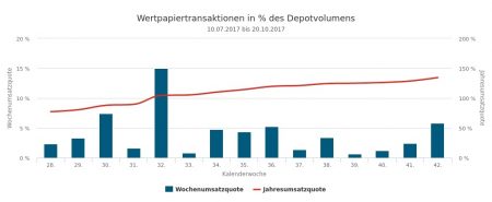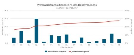 Der Handel der von uns erfassten Vermögensverwaltungen war in der 43. Woche vom 23. bis 27.10.2017 mit einer Umsatzquote von 2,39% (bezogen auf das für den Newsletter gemeldete Depotvolumen von 328 Mio. Euro) und einem Umsatzvolumen von 7,82 Mio. Euro verhältnismäßig ruhig. Dabei war der „informatorische“ Verlauf der Woche keinesfalls so still, wie der von uns erfasste Handel vielleicht glauben machen könnte.