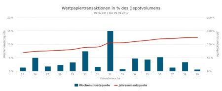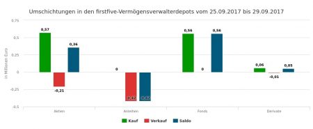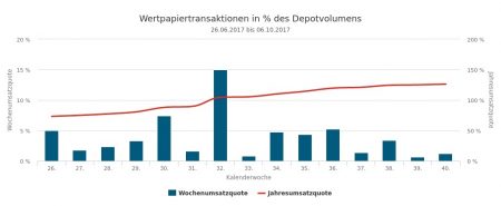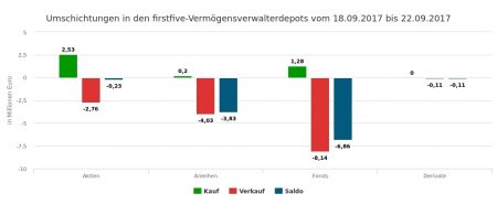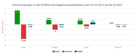 Verkäufe machten in der 41. Woche vom 9. bis 13.10.2017 lediglich knapp 29 Prozent des Gesamtumsatzes aus. Da dieser außergewöhnlich gering war, fiel der Verkaufsumsatz im Vergleich zum langfristigen Durchschnitt noch geringer aus. Die Verkäufe im Wert von 0,85 Mio. Euro verteilten sich auf Anleihen (0,48 Mio. Euro), Aktien (0,20), Derivate (0,17) und Fonds (0,01).