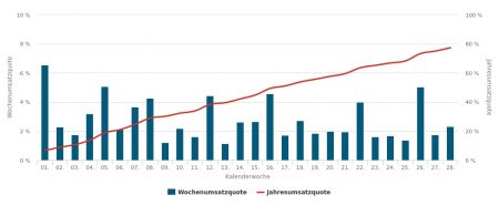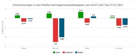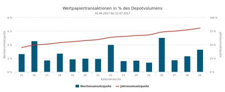 In der Berichtswoche vom 17.07. bis 21.07.2017 wurden 3,28% des gemeldeten Depotvolumens gehandelt. Das entspricht einem leicht überdurchschnittlichen Wert, wenn wir die Vergleichsquoten der letzten Monate zugrunde legen. Allerdings betrug das Umsatzvolumen nur 7,3 Mio. Euro; und das ist unterdurchschnittlich. Der Grund: Das gemeldete Depotvolumen – d.h. die Summe der Volumina der