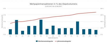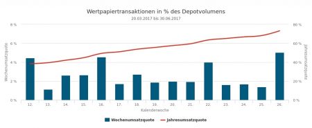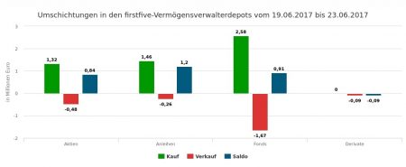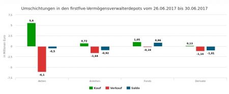 Die Verkäufe im Volumen von 8,46 Mio. Euro verteilten sich auf Anleihen (5,10 Mio. Euro), Derivate (1,62), Fonds (0,97) und Aktien (0,77). Die größten Posten bei den Obligationen machten Veräußerungen von Staatsanleihen aus: Die erst-, die dritt- und die fünftplatzierte Transaktion von Italien- und Spanienpapieren machten zusammen knapp 83% des Verkaufsvolumens im Rentensegment und in etwa die Hälfe des Verkaufsumsatzes in der 27. Woche aus.