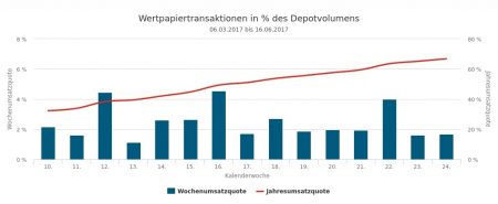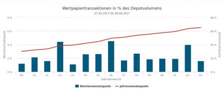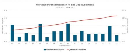 Die Handelsquote der Berichtswoche von 1,67% hievte den kumulativen Umsatz seit Beginn dieses Jahres auf knapp über zwei Drittel des Gesamtdepotvolumens oder präziser: auf 66,79%. „Zwei Drittel erst umgesetzt“ wäre möglicherweise in Anbetracht dessen, dass in den Vorjahren diese Marke bereits im März, April, einmal sogar im Februar, überschritten worden ist, die passendere Überschrift.
