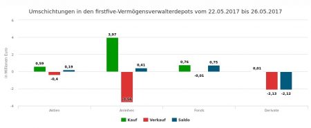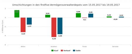 Die Verkäufe waren etwas breiter gestreut als die Käufe, aber das ist schon fast ironisch zu verstehen, denn es bedeutet: zwei Aktien neben lauter Anleihen. Eine dieser Aktien schaffte es in das Ranking der Topverkäufe gemäß Depotgewicht: Eine Vermögensverwaltung aus dem Hessischen trennte sich von Royal-Dutch-Shell-Aktien.