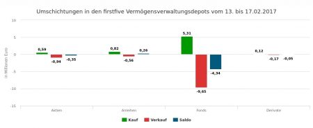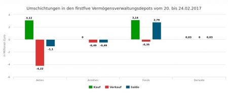 Auf der Verkaufsseite verteilte sich ein Umsatzvolumen von lediglich 2,41 Mio. Euro auf die Veräußerung von Stücken Festverzinslicher (1,41 Mio. Euro), von Aktien (0,72), Derivaten (0,18) und Fondsanteilen (0,11).