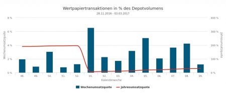Im Beobachtungszeitraum zwischen dem 27.02. bis 03.03. wurden 1,21 Prozent des gemeldeten Depotvolumens von insgesamt rund 610 Mio. Euro umgesetzt.