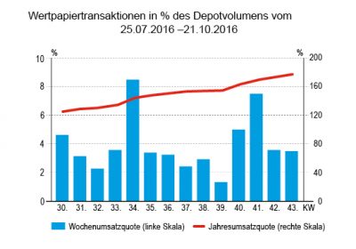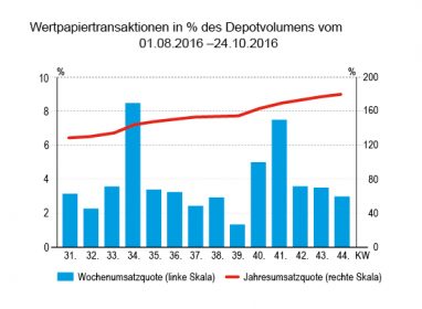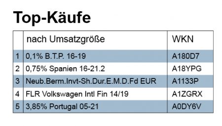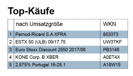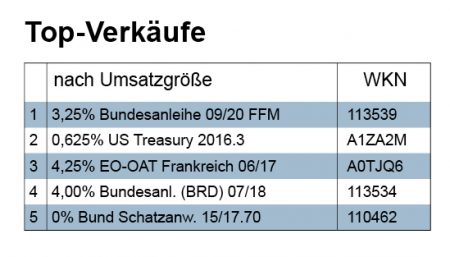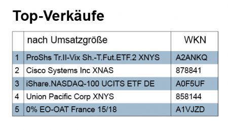 Die Verkäufe im Umfang von 9,93 Mio. Euro verteilten sich auf Anleihen (3,85), Aktien (3,2) und Fonds (2,88). Damit war verkaufsseitig die Verteilung auf die einzelnen Assetklassen deutlich weniger ungleich als kaufseitig und die Dominanz der Festverzinslichen war weniger ausgeprägt. Abgegeben wurden bei den Aktien Papiere unter anderem von: Cisco Systems, Union Pacific, Kinder Morgan, Dürr und Electronic Arts, um nur die first five im Aktienverkaufs-Ranking nach Umsatzvolumen zu nennen.