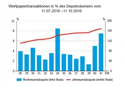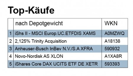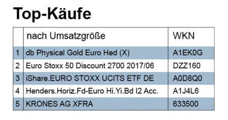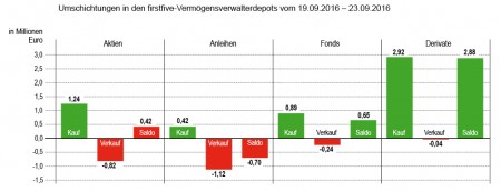 Die uns gemeldeten Transaktionen betrafen Depots von wenig mehr als 120 Millionen Euro Vermögen. Dafür waren die Umsätze in diesen Depots sehr hoch und machten immerhin 7,52 Prozent der gesamten Depotwerte aus. Am meisten Umsatz fiel auf Anleihen. Auch Fonds standen im Fokus des Interesses. Bei Aktien war man (vor allem auf der Nehmerseite) zurückhaltender. Überraschend hoch fielen die Zertifikateumsätze (dieses Mal ganz ohne Gold) aus.