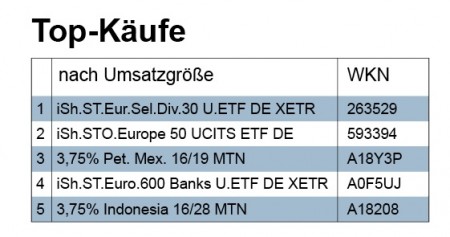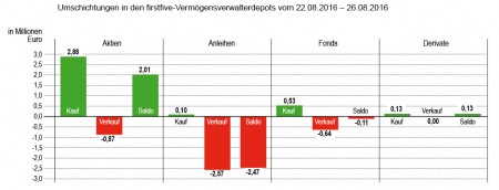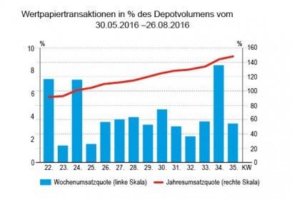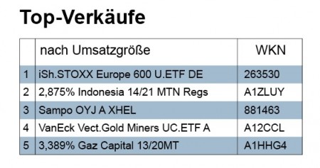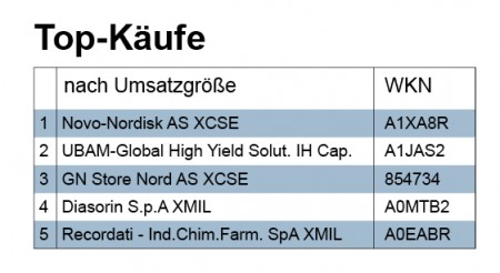 Die Umsätze bewegten sich in der Berichtswoche im Normalbereich. Rund 22 Millionen Euro setzten die Depotmanager um. Am meisten Handel zogen Fonds auf sich. Fast die Hälfte aller Geschäfte fiel auf diese Produktklasse. Dahinter punkteten wieder Anleihen mit einem Umsatzanteil von rund sieben Millionen Euro.