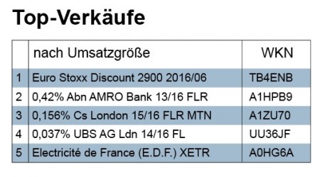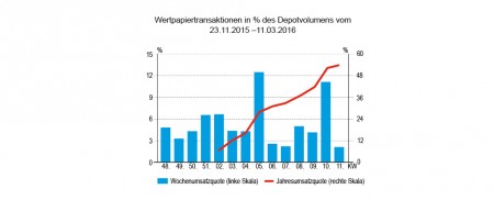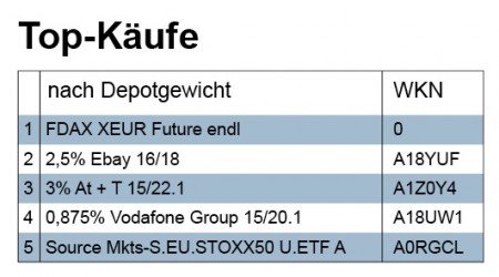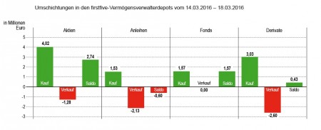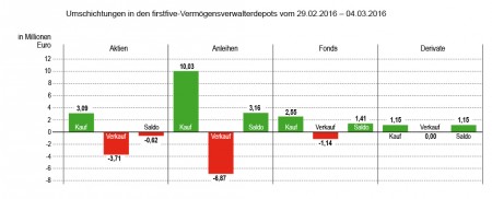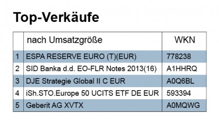 Verkauft wurden in der Karwoche größtenteils nur Fondsanteile für knapp über 3 Mio. Euro. Und ein strukturiertes Produkt, das zurückgezahlt wurde, trug mit weiteren 3 Mio. Euro ebenfalls zum Verkaufsumsatz bei. Der Beitrag zum Verkaufsvolumen von Aktien und Anleihen war hingegen verschwindend. In der zweiten Hälfte unserer Doppelwoche nach Ostern waren bei den Abgaben gleichfalls Fonds mit 5 Mio. Euro ganz vorne.