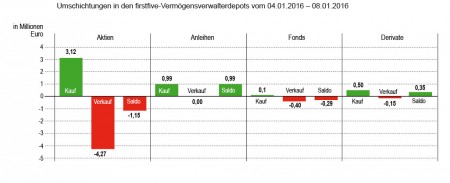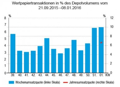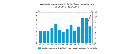Mit einem Anteil von 4,35 Prozent am gemeldeten Depotvolumen und einem Gesamtbetrag von knapp 42 Mio. Euro lag der Handel in der Berichtswoche über dem langfristigen Durchschnitt der Umsätze.