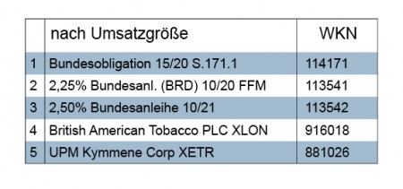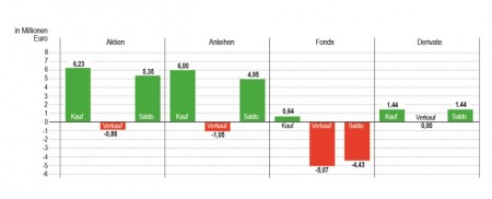 Die insgesamt neun Aktienkäufe verteilten sich auf deutsche Blue Chips (BMW, Merck, Bayer) und zwei weitere europäische Titel (Pernod-Ricard, Novartis, Reckitt Benckiser). Im Rentenbereich waren – bis auf eine rumänische Staatsanleihe