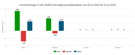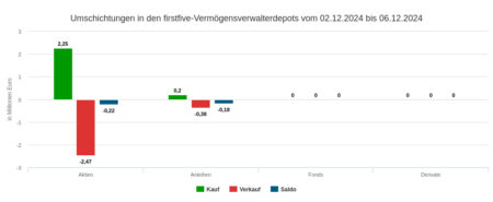 Bis kurz vor Weihnachten setzten die Vermögensverwaltungen unserer Depotausschnitte im Jahr 2024 mit ihren Käufen und Verkäufen 126,26 Mio. Euro um. Berücksichtigung fanden darin 50 Handelswochen. Den etwas größeren Teil des Umsatzes generierten die Verwaltungen im zweiten Halbjahr: Knapp 69 Mio. Euro. Auf das erste Halbjahr entfielen rund 57 Mio. Euro.