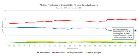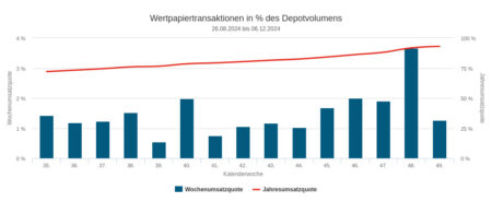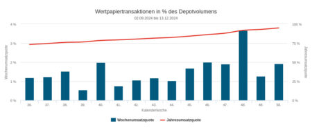 Bis kurz vor Weihnachten setzten die Vermögensverwaltungen unserer Depotausschnitte im Jahr 2024 mit ihren Käufen und Verkäufen 126,26 Mio. Euro um. Berücksichtigung fanden darin 50 Handelswochen. Den etwas größeren Teil des Umsatzes generierten die Verwaltungen im zweiten Halbjahr: Knapp 69 Mio. Euro. Auf das erste Halbjahr entfielen rund 57 Mio. Euro.